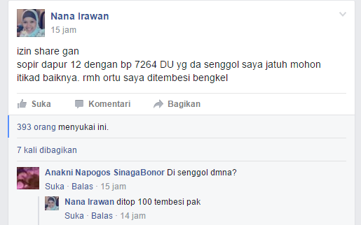 Dengan tegas nana dalam salah satu statusnya yang ia tuliskan di laman grup Facebook. Nana bahkan menyebutkan plat nomor kendaraan ugal-ugalan yang meninggalkanya saat ia terjatuh "sopir dapur 12 dengan bp 7264 DU yang da senggol saya jatuh mohon itikad baiknya. rmh ortu saya ditembesi bengkel" demikian yang dituliskan Nana dalam statusnya.
