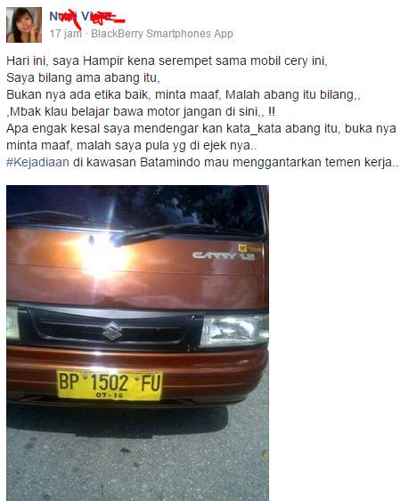 seorang netizen berinisial NV mengadu ia menjadi korban serempet cary/ angkutan umum beroperasi di wilayah mukakuning-batu aji (25/2/2016). netizen tersebut bahkan memposting dengan jelas plat nomor polisi angkutan umum yang menyerempetnya. dalam postingannya ia mengakui hampir diserempet oleh kendaraan umum tersebut. ketika menegur pengemudinya ia justru yang di bully "makanya kalau masih belajar jangan disini" ujar NV menirukan perkataa sopir Carry tersebut.