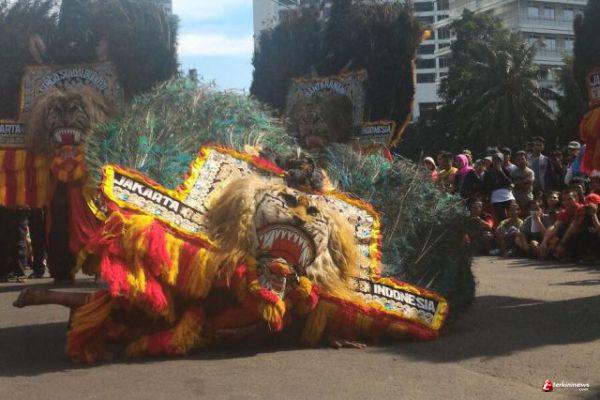 JAKARTA - Hari Bebas Kendaraan Bermotor (HBKB) atau lebih dikenal dengan Car Free Day dimeriahkan dengan penampilan kesenian Reyog Ponorogo. Para seniman dari Komunitas Reyog Ponorogo (KRP) unjuk kebolehan di depan Grand Indonesia Jl. MH Thamrin Jakarta Pusat, Minggu (13/03/2016).