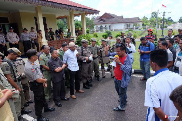 Pantauan lapangan, demonstrasi berlangsung kondusif dengan pengawalan pihak Satpol PP dan Polsek Daik Lingga. Wakil Bupati Lingga, Muhammad Nizar bersama Kepala Badan Kepegawaian dan Diklat (BKD) Lingga Syamsudi, berhadapan langsung dengan para demonstrans.