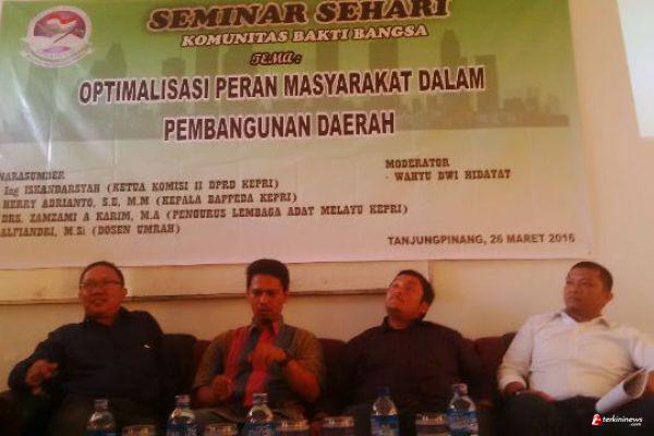 “Program pengentasan kemiskinan dan membuka lapangan pekerjaan harus diprioritaskan, salah satunya dengan meningkatkan pendapatan keluarga,” ujarnya dalam seminar berteman “Optimalisasi Peran Masyarakat Dalam Pembangunan Daerah” di Kampus Stisipol Raja Haji.
