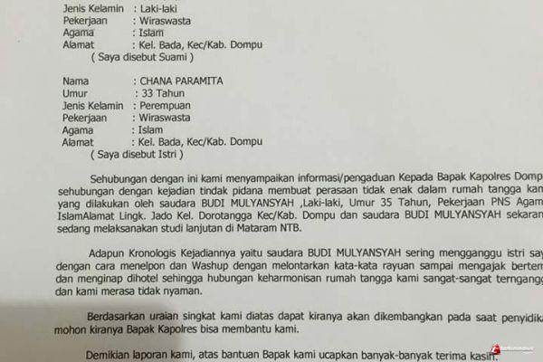 Oknum pegawai tersebut telah menggoda istri Ujang via medsos Whatsaap yang ingin meminta ketemuan di Hotel, sang pelaku juga meminta pada korban yang dia ketahui bernama Ujang untuk tidak memberitahukannya, namun malang hal ini telah terlebih dahulu diketahui suami korban yang pada akhirnya senin (28/03/2016) suami korban mengirim surat pengaduan ke Polres Dompu, tapi belum ada tanggapan dan hasil, akhirnya selasa 29/03/2016, pukul 20.30 ia menghadap Bupati Drs H Bambang akan tetapi ajudan bupati menjawab bapak bupati lagi keluar tadi pagi, akrirnya sang suamipun menghadap Bapak Arifuddin SH, selaku Wakil Bupati Dompu.