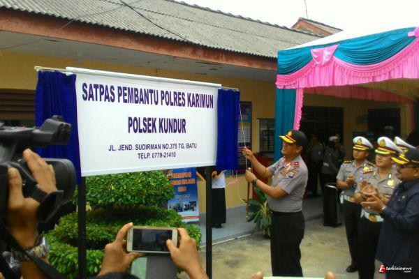 KARIMUN - Kapolda Kepulauan Riau (Kepri) Brigjen Pol Sam Budigusdian meresmikan Kantor Satuan Penyelenggara Administrasi Sim (Satpas) pembantu Polres Karimun di Polsek Kundur beserta pejabat utama Polda Kepri, Bupati Karimun H.Aunur Rafiq, Kamis (21/04).