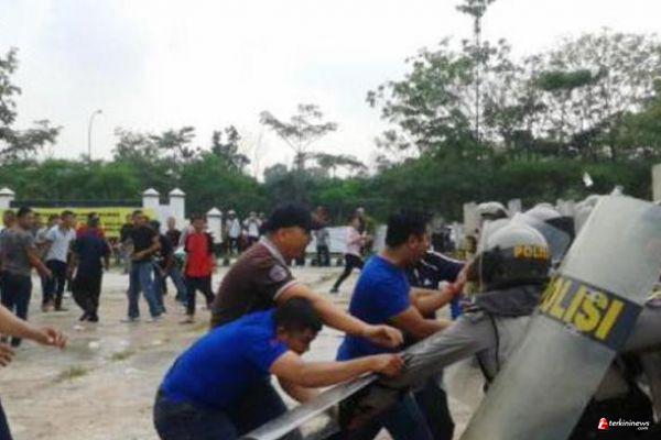 Jelang mayday yang akan berlangsung beberapa hari lagi, ratusan anggota kepolisian dari Polresta Barelang menggelar simulasi penangangan demonstrasi di Alun-alun Engku Putri Batam Centre (26/4/2016). Lokasi yang nanti nya akan menjadi pusat demonstrasi buruh memperingati May day.