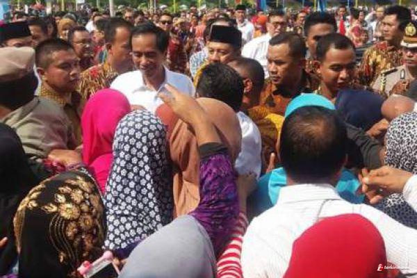 Sebelum bertolak ke bandara,jokowi menyempatkan diri untuk melihat suasana pasar dan pedagang sekaligus bersalaman dengan warga juga membagikan buku.