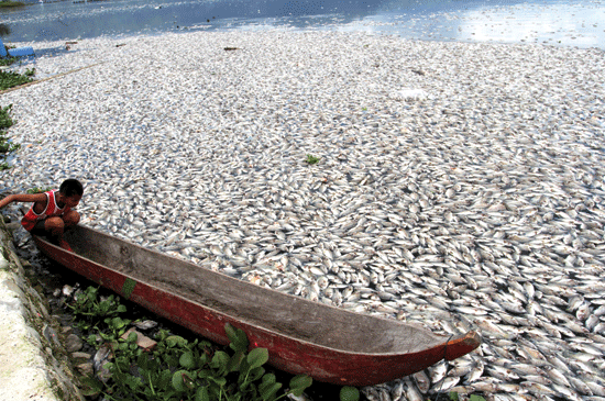 Ikan ternakan di keramba, Mas dan Nila tersebut kekurangan oksigen, karena jumlah populasi tidak sesuai dengan luasan area.