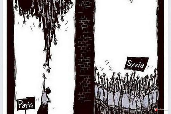 Melalui Fanpage Facebooknya, komik yang tahun 2015 menyabet gelar 'Best Local Comic' ini memposting sebuah gambar tentang dua tragedi TEROR PARIS ATTACK yang mendapat empati gegap gempita dunia sementara TEROR ALEPPO oleh rezim Assad dunia sepi dari empati.