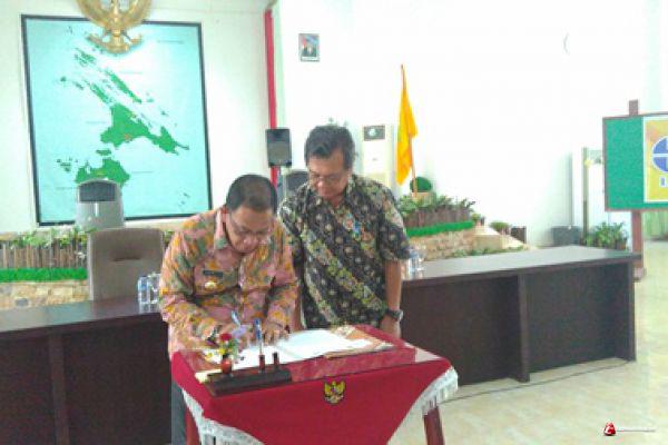 LINGGA - Bupati Lingga, Alias Wello tandatangai program kerjasama dengan Lembaga Ilmu Pengetahuan Indonesia (LIPI) di aula balai pertemuan Junjungan Negeri Bunda Tanah Melayu kantor Bupati Lingga, Kamis (12/5). Dengan kontrak kerja sama ini pemerintah Kabupaten Lingga, mengharapkan semua sektor potensi yang dimiliki Kabupaten Lingga dapat dimanfaatkan dengan maksimal.