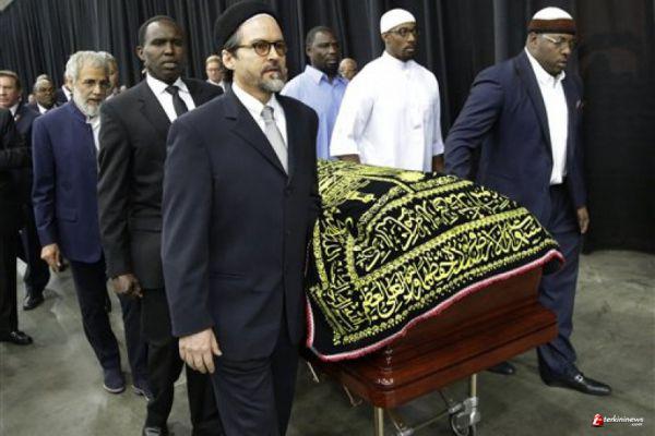 Imam Zaid Shakir, pendiri sekolah Zaytuna College di Berkeley, Kalifornia memimpin shalat jenazah. Jenazah Ali terbaring di peti mati yang dilapisi kain bertuliskan bahasa Arab berwarna hitam dan emas.