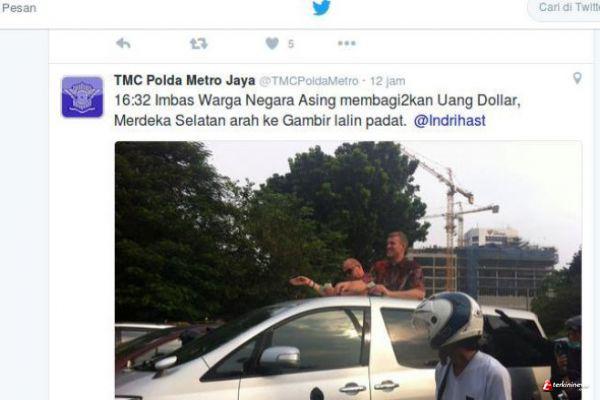 "Imbas Warga Negara Asing membagi2kan Uang Dollar, Merdeka Selatan arah ke Gambir lalin padat," demikian tulis akun twitter TMC Polda Metro Jaya. (detik)