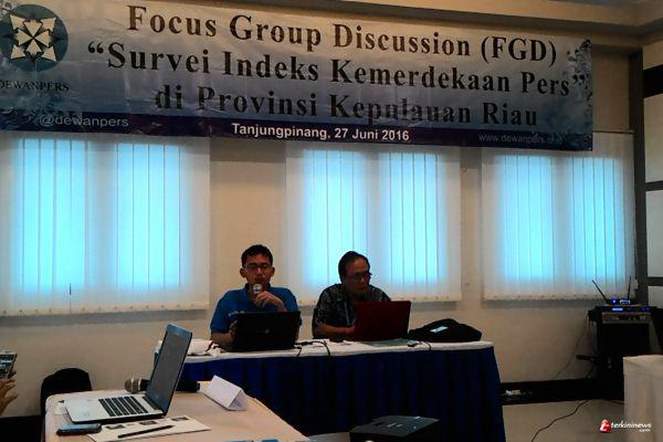 TANJUNGPINANG - Dewan Pers Indonesia menggelar focus group discussion atau diskusi terarah di Hotel CK Tanjungpinang, Senin (27/6). Diskusi digelar bertujuan untuk mengetahui sejauh mana informan ahli menilai kemerdekaan pers yang ada di Kepulauan Riau. Sebelumnya peserta FGD sudah dibekali dengan kuesioner.