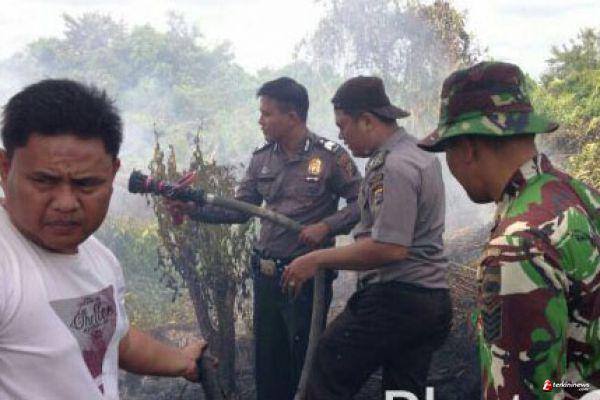 PEKANBARU - Sejumlah personil Polsek dan Koromil Siak Hulu, Kampar diterjungkan ke lokasi kebakaran lahan di Jalan Persawahan Desa Kubang Jaya, Sabtu (2/7/16). Mereka bahu membahu untuk memadamkan kebakaran lahan. Selain itu, seorang warga bernama Luparto Sinaga (42) diamankan karena sengaja membakar lahan tersebut.