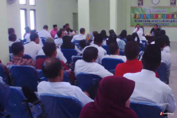 BENGKALIS- Sekitar 120 kepala dan bendahara sekolah serta utusan perguruan tinggi (PT) di Kecamatan Bengkalis mengikuti kegiatan sosialisasi Jaksa Masuk Sekolah (JSM), Rabu (10/8/16). Kegiatan ditaja Dinas Pendidikan (Disdik) dan Kejaksaan Negeri (Kejari) Bengkalis ini berlangsung sehari di Aula Kantor Unit Pelaksana Teknis Dinas (UPTD) Disdik Kecamatan Bengkalis Jalan Antara.