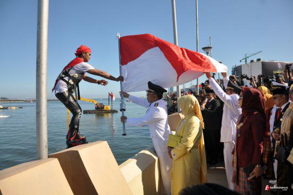 Menggunakan flyng board, Andi Rahmat yang juga cucu pahlawan dan pejuang 45 Andi Mattalatta menerima bendera merah putih dari Wali Kota Makasssar Mohammad Ramdhan 'Danny' Pomanto, dan Alam menerima bendera merah putih dari Ketua DPRD (Dewan Perwakilan Rakyat Daerah) kota Makassar Farouk M Betta.