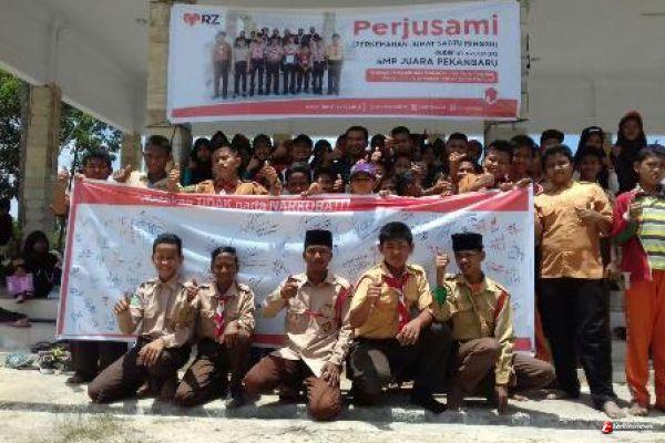 PEKANBARU - Sekitar 140 siswa baru SMP Juara Pekanbaru, Kota Pekanbaru sepakat deklarasikan “Pelajar Anti Narkoba”, sebagai bagian dari kepedulian serta harapan mereka agar pelajar menjauhi barang haram tersebut. Dan program ini dibuktikan dengan menandatangani spanduk dukungan pelajar anti narkoba.