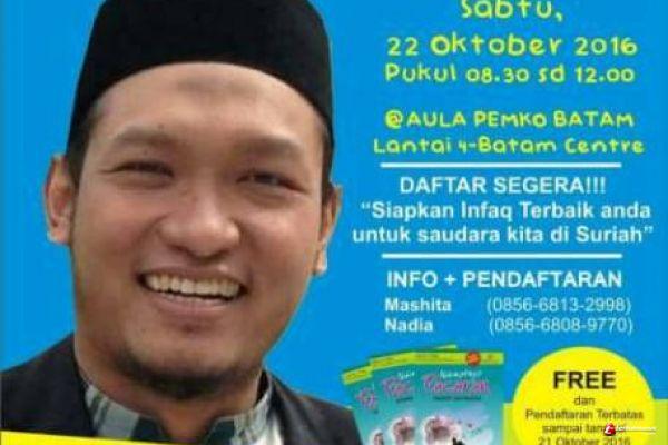 "Acara ini bekerjasama dengan dpu daarut tauhiid batam untuk bersama menebar kebaikan. Dan kali ini kami akan melakukan penggalangan dana untuk saudara-saudara kita yang di suriah. Agar mereka dapat merasakan nikmatnya dari setiap kebaikan ini," tutupnya.