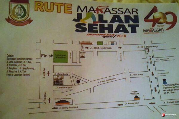Jalan sehat akan berlangsung Minggu, 6 November 2016, dijadwalkan Wali Kota Makassar, Mohammad Ramdhan 'Danny' Pomanto akan melepas peserta jalan sehat di Monumen Mandala jalan Jenderal Sudirman setelah itu peserta akan melewati rute di jalan Dr Sam Ratulangi berbelok ke jalan Haji Bau kemudian ke jalan Penghibur lanjut ke jalan Ujung Pandang lalu berbelok ke jalan Ribura'ne dan finish di lapangan Karebosi jalan Jenderal Ahmad Yani.