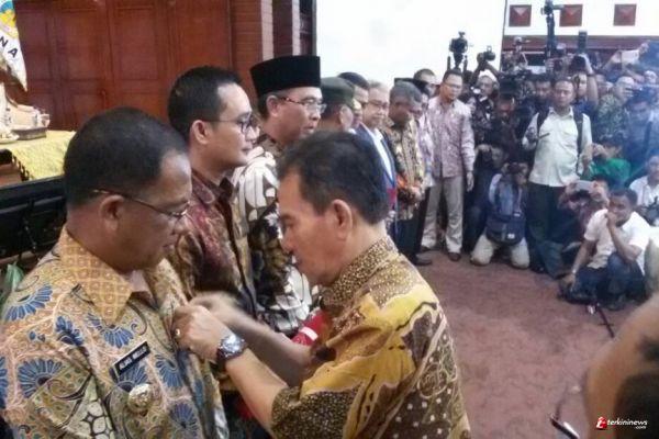 LINGGA - Bupati Lingga Alias Wello menerima lencana Adhi Bhakti Tani Nelayan Pratama dari Ketua Umum Kontak Tani Nelayan Andalan (KTNA) pusat, Ir H Winarno Tohir, saat mengahadiri PENAS KTNA di Banda Aceh, Jum’at (5/5). Penyematan lencana kepada Bupati Lingga dan empat Kepala Daerah berprestasi dibidang pertanian lainnya se-Indonesia tersebut, disaksikan langsung Meteri Pertanian RI Andi Amran Sulaiman dan Panglima TNI Jendral Gatot Nurmantyo, Kamis (04/04).