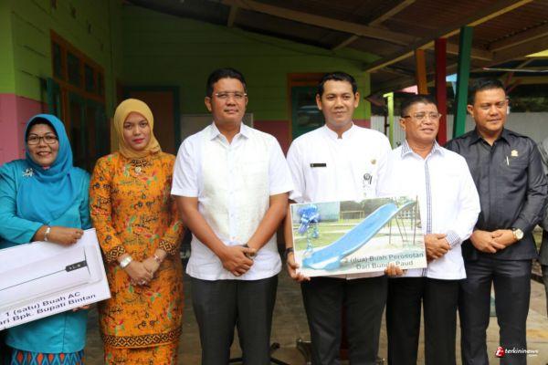 Bupati Bintan secara langsung memberikan bantuan 1 (satu) unit AC diikuti Bunda Paud Bintan yang memberikan 2 (dua) set papan seluncuran sebagai salah satu wahana bermain.