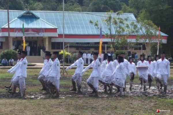 LINGGA - Memperingati hari kemerdekan Republik Indonesia yang ke 72 tahun, berbagai momentum bisa ditampilkan baik memang sudah direncanakan maupun terjadi sesuai keadaan alam. Pasukan pengibar bendera ( Paskibra) di kecamatan Lingga Utara pada upacara Kamis,(17/8/2017) bertempat di tempat kantor camat Lingga Utara, harus berlumpur ria karena lapangan digenangi hujan dan berlumpur.