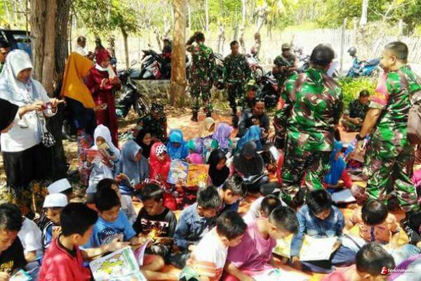 BIMA, -- Dalam menumbuh kembangkan minat baca dikalangan masyarakat, khususnya anak-anak. Rumah Baca Salahuddin Al Ayyubi dan Koramil 1608-03/Sape, menggelar kegiatan perpustakaan keliling.