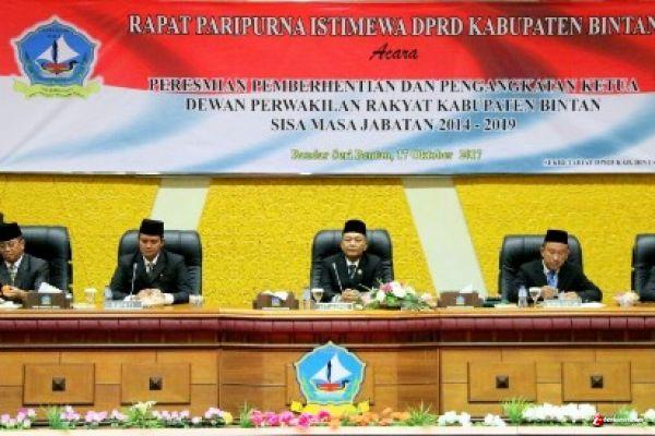BINTAN, -- Ketua Pengadilan Negeri Tanjungpinang Joni, SH, MH resmi melantik H Nesar Ahmad, S.Ip sebagai ketua DPRD kabupaten Bintan sisa masa Jabatan 2014-2019 di sidang paripurna DPRD kabupaten Bintan, Selasa (17/10/2017) yang turut dihadiri Bupati dan Wakil Bupati Bintan, Sekda beserta seluruh jajaran OPD Kabupaten Bintan.