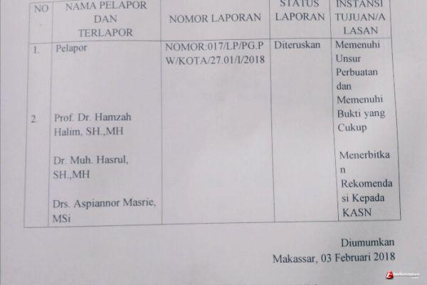 Adapun ketiga dosen Unhas tersebut telah memenuhi unsur perbuatan dan memenuhi bukti yang cukup untuk menerbitkan rekomendasi kepada KASN, isi edaran status laporan itu.