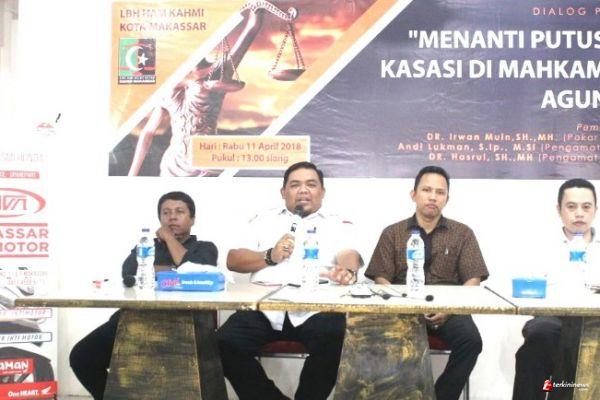 MAKASSAR, -- LBH HAM KAHMI Kota Makassar yang menggelar Dialog Publik bertemakan "Menanti Putusan Kasasi di Mahkamah Agung" menghadirkan pembicara pada topik tersebut antara lain, Dr. Irwan Muin SH MH (pakar hukum), Andi Lukman, S Ip. M. SI (pengamat politik)