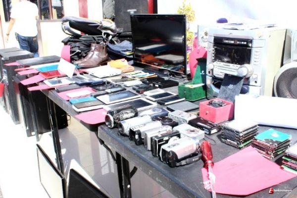 Sementara hingga saat ini berhasil diamankan barang bukti berupa 1 Unit Mobil Toyota Soluna Warna Silver. 1 Unit Mobil Suzuki Swif warna Silver. 1 Unit spd motor Merk Yamaha X-Ride Warna Hitam. 5 Unit TV berbagai macam Merk. 13 Laptop berbagai macam Merk beserta Charger. 17 Unit HP Berbagai macam Merk. 5 Unit HandyCam berbagai macam Merk. 7 Unit Kamera Berbagai Macam Merk. 2 Buah Jam tangan. 1 Pasang Speaker Laptop. 17 Buah Hard Disk. 7 Buah External Disk. 2 Buku Rekening. 5 Buah Tas Ransel. 3 Tas Laptop. 1 Pasang Sepatu warna Cokelat. 1 Unit Kalkulator Merk Casio. 1 Set Speaker Aktif Merk Avante. 1 Unit Lemari Es Mini Merk Krisbow dan 1 Unit Tape Radio Merk LG