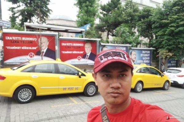 Recep Tayyib Erdogan. Recep Tayyib Erdogan. Recep Tayyib Erdogan. Demikian reff dari lirik lagu kampanye yang diputar lewat mobil minibus mengelilingi Kota Istanbul, Turki. Berulang-ulang reff lirik itu diputar ketika penulis mengunjungi Turki sepekan lalu. 12 - 17 Juni 2018. Oh, penulis baru ngeh ternyata ini musim kampanye dan Turki akan melakukan Pemilihan Raya atau Pemilu Presiden dan Parlemen secara serentak 24 Juni mendatang.