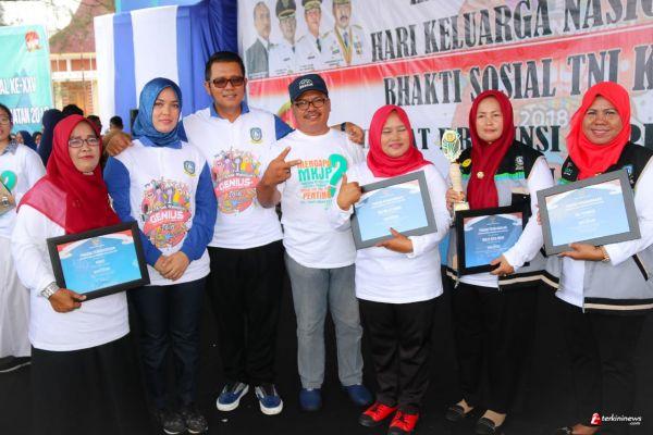 BINTAN - Bupati Bintan H Apri Sujadi, S.Sos didampingi Ketua TP PKK Kabupaten Bintan Ibu Hj Deby Maryanti mengapresiasi atas penghargaan yang diraih oleh perwakilan Kabupaten Bintan saat agenda Peringatan Hari Anak Nasional, Hari Keluarga Nasional Dan Bhakti Sosial TNI KB-KES Tingkat Provinsi Kepri Tahun 2018 di Relief Antam Kijang, Kec Bintan Timur, Senin (16/7) pagi.