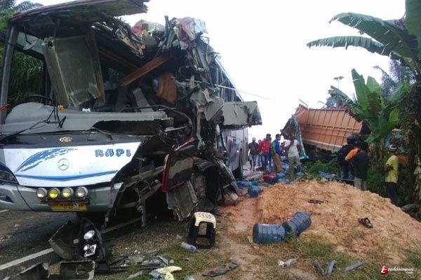 PEKANBARU- Terjadi kecelakaan maut yang melibatkan Bus Rapi dengan truk pengangkut galon air mineral, Kamis (26/7/18). Peristiwa yang terjadi pada pukul 6.00 WIB tersebut semula dinyatakan berlokasi di Kiyab Jaya, Kecamatan Bandar Sikijang, Kabupaten Pelalawan, namun yang tepat adalah di Desa Kerinci Kiri, Kecamatan Kerinci Kanan, Kabupaten Siak. Kekeliruan tersebut terjadi karena antara dua wilayah tersebut hanya dipisahkan Jalan Lintas Timur.