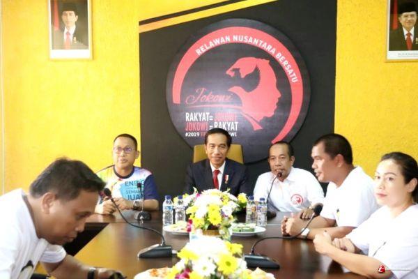 MAKASSAR, -- Presiden RI. Jokowi menyempatkan waktu mengunjungi posko relawannya di Jalan Ratulangi, dan disambut ketua Relawan Nusantara Sulawesi Selatan, Fitra Burhan, Farouk M Betta dan Rahman Pina.
