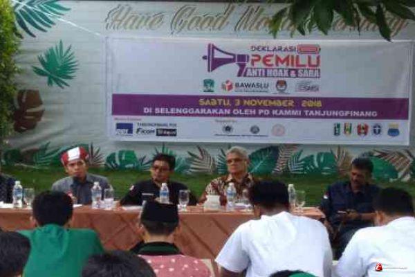 TANJUNGPINANG - Kesatuan Aksi Mahasiswa Muslim Indonesia (KAMMI) Kota Tanjungpinang bersama KPU, Banwaslu PWI Serta SMSI mendeklarasikan kampanye pemilu damai anti hoaks dan SARA di Kafe Keboon, Batu 5 Atas, Sabtu (3/11/2018).