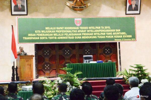 MAKASSAR, -- Antisipasi perkembangan situasi dan kondisi menjelang tahun politik 2019, khususnya Pilpres dan Pileg di wilayah teritorialnya, Staf Intelijen Kodam XIV Hasanuddin menggelar rapat koordinasi teknis (Rakornis) bidang Intelijen/Pengamanan.