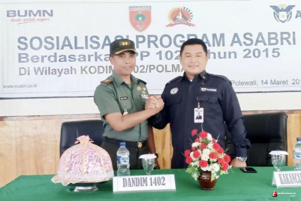POLMAN, -- Dandim 1402/Polman Letkol Arh Dedi Setia Arianto, menerima Tim sosialisasi Kakancab PT. Asabri (Persero) Makassar dan Bank BTPN sebagai mitra bayar dan dilanjutkan sosialisasi, yang diikuti oleh seluruh prajurit dan PNS TNI, Polri serta Persit dan Bhayangkari se Kabupaten Polman, bertempat Baruga Mammesa Kodim Jl. Mr. Muh. Yamin Kabupaten Polmas,