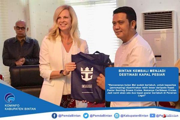 "Rencananya bulan Mei sudah berlabuh, untuk kapasitas (penumpang) diperkirakan lebih besar daripada Kapal Pesiar Genting Dream Cruise. Namanya Caribbean Cruise. Jadi nanti akan ada dua kapal pesiar berlabuh di Perairan Lagoi " ujar Bupati Bintan H Apri Sujadi, S.Sos saat bertemu management Kapal Pesiar Caribbean Cruise di Ruang Bapelitbang Kabupaten Bintan , Selasa (23/4) kemarin
