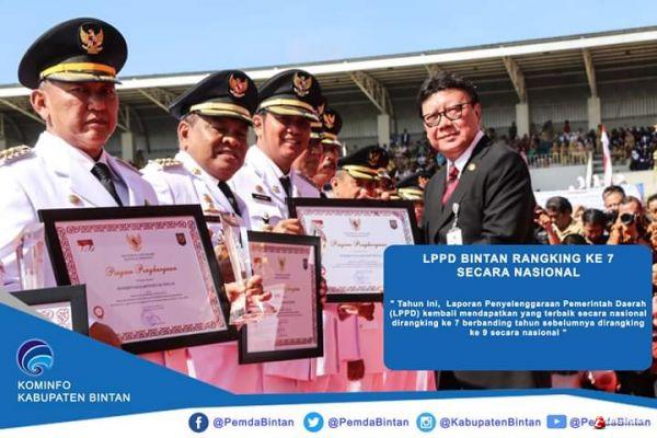 Bintan, -- Pemerintah Republik Indonesia melalui Kementerian Dalam Negeri Republik Indonesia kembali memberikan Penghargaan untuk Laporan Penyelenggaraan Pemerintah Daerah (LPPD) Terbaik bagi Kabupaten Bintan dengan ranking ke-7 dari total 397 Kabupaten se Indonesia.
