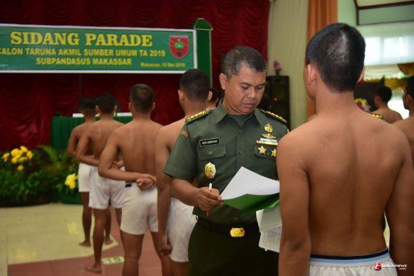 MAKASSAR, -- Sebanyak 86 calon taruna (Catar) Akmil tahun anggaran 2019 mengikuti sidang parade tingkat Subpandasus Makassar. Catar tersebut, merupakan calon yang berhasil tersaring dari 180 animo yang mendaftar, dan telah dinyatakan lulus menjalani berbagai tahap seleksi yang digelar oleh panitia Subpandasus Makassar, sebagai syarat menjadi calon taruna Akmil tahun anggaran 2019.