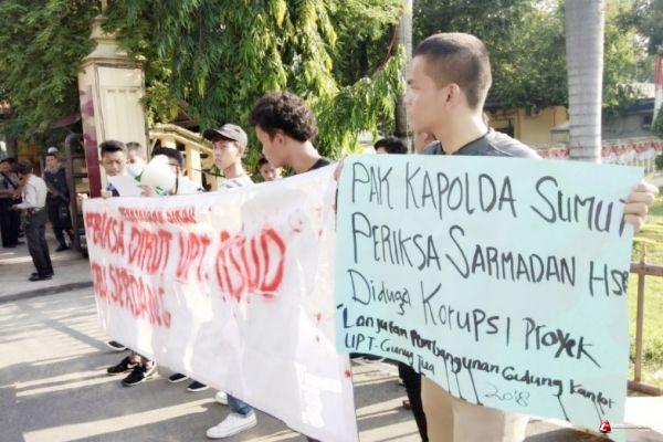 Medan. Sumut -- Puluhan mahasiswa kembali berunjuk rasa di depan kantor Markas Polisi Provinsi Sumatera Utara, Jalan Sisingamangaraja dengan maksud kedatangan hendak menyampaikan Aspirasi Pembangunan Proyek Lanjutan (PLP) pembangunan gedung kantor UPT Gunung Tua di jalan Merdeka No 12 Gunung Tua Senilai Rp. 3.835.745.000, tahun anggaran 2018 yang di kerjakan Perusahaan PT. Razasa Karya.