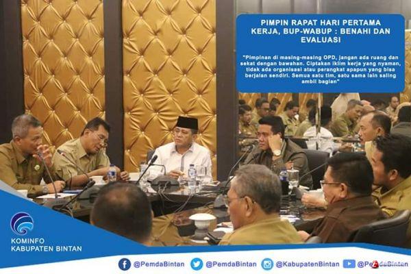 Usai Apel, seluruh Kepala OPD beserta Kabag di Setda Bintan dikumpulkan untuk melaksanakan Rapat Evaluasi bersama Bupati dan Wakil Bupati Bintan. H. Apri Sujadi dalam mukadimahnya langsung terfokus pada kinerja seluruh OPD.