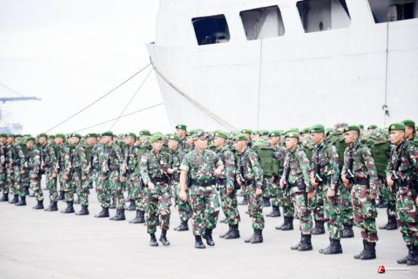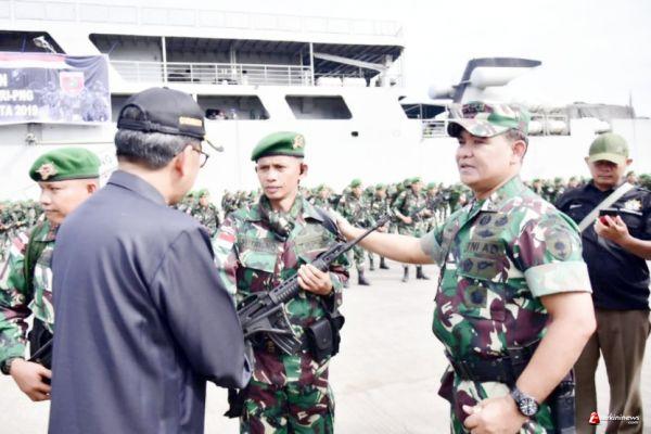 MAKASSAR, -- Pangdam XIV/Hasanuddin Mayjen TNI Surawahadi,S.I.P.,M.Si. Pimpin langsung upacara pemberangkatan Satgas Pamtas Penyangga RI-PNG Yonif 721/Makkasau di pelabuhan Soekarno Hatta Makassar, Rabu (3/7/2019) terkininews.com