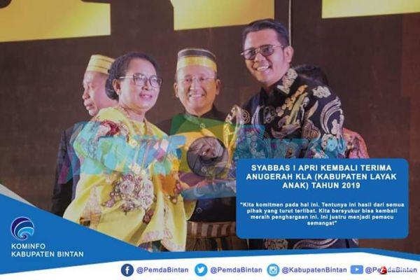 BINTAN, -- Untuk kali kedua, Kabupaten Bintan yang dinahkodai Apri Sujadi meraih anugerah Kabupaten Layak Anak (KLA) dari Kementerian Pemberdayaan Perempuan dan Perlindungan Anak Republik Indonesia. Penghargaan tersebut diterima Apri saat menghadiri Malam Puncak Peringatan Hari Anak Nasional tahun 2019 di Four Points by Sheraton Kota Makassar, Selasa malam (23/7) yang diserahkan langsung oleh Menteri PPPA RI Yohana Susana Yembise.