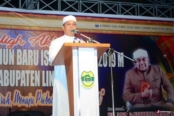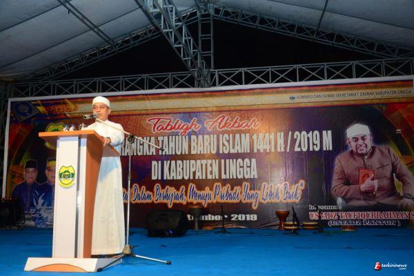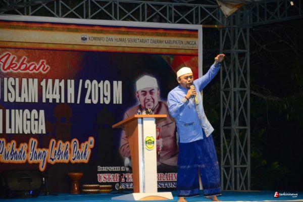 LINGGA. -- Sempena memperingati Tahun Baru Islam 1441/ 2019 M, Pemerintah Kabupaten Lingga gelar tabligh akbar dengan menghadirkan Ustadz Taufiqurrahman. Rabu (11/9) Malam. Kedatangan Ustadz Pantun sapaan akrab Ustadz Taufiqurrahman disambut antusias masyarakat Lingga, yang memenuhi halaman lapangan kantor Bupati Lingga.