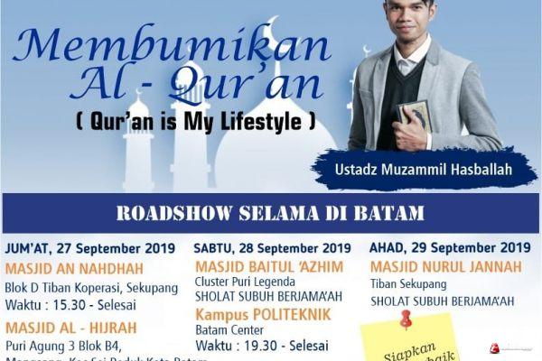 Kegiatan ini diselenggarakan oleh Lembaga Amil Zakat Daarut Tauhiid (DT) Peduli Batam. Dengan mengusung tema “Membumikan Al-Qur’an (Qur’an Is My Lifestyle), kajian yang akan diisi oleh Ustad Muzammil Hasballah nanti berisikan motivasi mencintai Al-Quran “nantinya para peserta akan diberikan motivasi bagaimana menjadikan Al-Qur’an sebagai pedoman hidup serta bagaimana cara istiqomah mengamalkan perintah-perintah yang disampaikan Allah melalui kitab-Nya” Ujar Deni, penanggung jawab kegiatan ini.