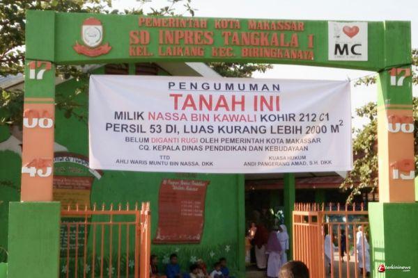 MAKASSAR, -- Kuasa hukum ahli waris pemilik lahan yang telah terbanguni sebuah sekolah dasar SD Inpres Tangkala 1 melakukan pemasangan spanduk pengumuman kepemilikan lahan.