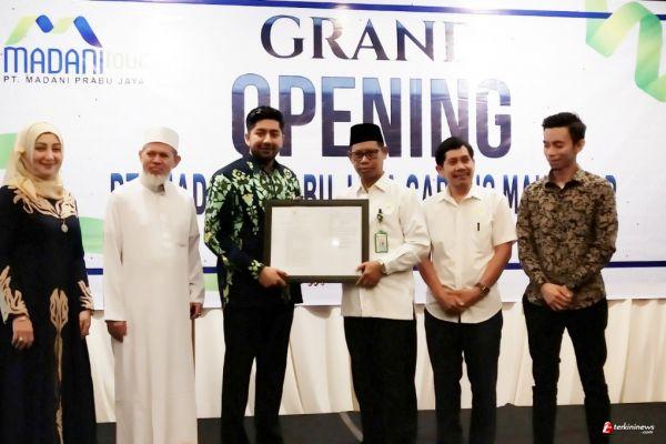 Grand Opening yang dilaksanakan Rabu (20/11/2019) bertempat di ballroom Jazmine Hotel Claro Makassar di hadiri dan dibuka Kepala Bidang Haji dan Umroh Kemenag Kawil Sulsel, Dr H Kaswan Sartono yang sekaligus menerima legalitas PT Madani Prabu Jaya Cabang Makassar.