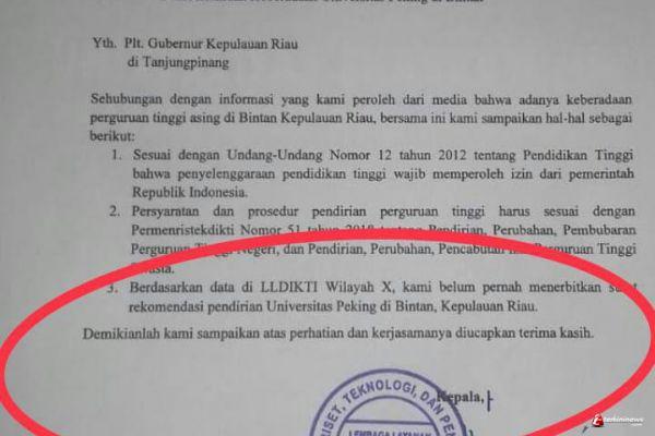 Hal itu terlihat dari beredarnya surat LLDikti Nomor 356/L10/KL/2019 tentang perihal pemberitahuan keberadaan Universitas Peking di Kabupaten Bintan, Kepulauan Riau. Surat tersebut ditandatangani langsung Kepala LLDikti Wilayah X Prof Dr. Herri, SE, MBA