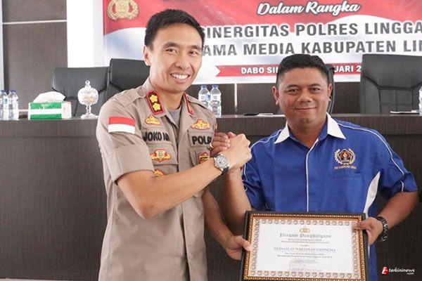 ‘’Hari ini PWI Lingga memberikan penghargaan kepada Kapolres Lingga sebab beliau dinilai cukup peduli terhadap pers yang ada di Kabupaten Lingga, serta memberikan inspirasi dan teladan terutama dianggap cukup berhasil membawa Lingga pada situasi kondusif serta mampu menuntaskan persoalan sosial dan ikut memberikan solusi.’’tutur Ketua PWI Lingga Jhony Prasetya yang didampinggi Sekretaris PWI Lingga Iman Arifandy Rabu (08/01/2020).