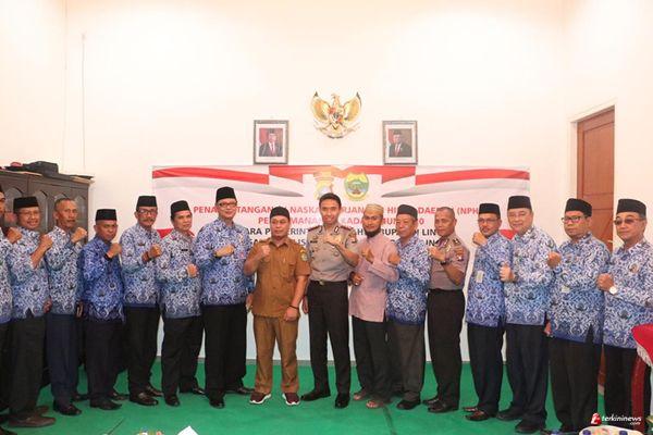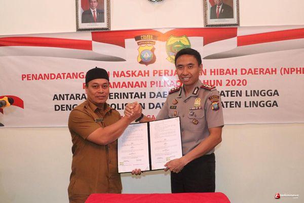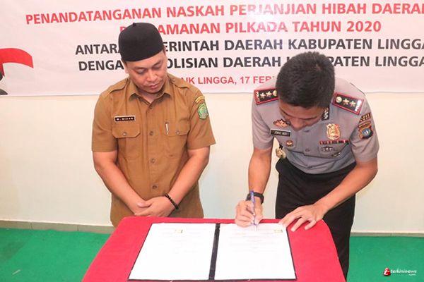 LINGGA - Pemerintah Kabupaten Lingga bersama Polres Lingga melaksanakan penandatangan Naskah Perjanjian Hibah Daerah (NPHD), tentang Pengamanan Pilkada 2020, Senin (17/2/2020).
